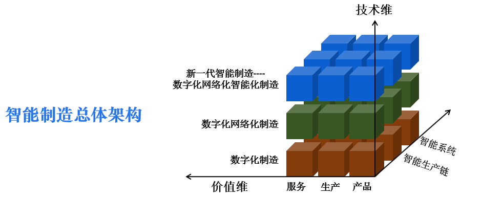 智能制造涵盖了产品、制造、服务全生命周期中所涉及的理论、方法、技术和应用,其总体架构可以从价值维、技术维和组织维三个维度描述。